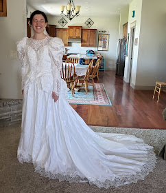 Lorraine is one of the most practical minded people I know. She is in a major cleaning-out-stuff mode and as we were working on that, she said "What am I going to do with my wedding dress?" She's kept it all these years (30) but hates the idea of it being stuffed away in a cedar chest for another 30 years. She doesn't really have any one to give it to and it is not exactly the latest fashion in wedding dresses even if she did. Kind of half jokingly, I said "You could make a quilt." She said, "You can DO that???" And thus the foray into the unknown was born. She fell in love with the idea and not only am I using her dress to make a quilt, but her mother's dress and veil as well.